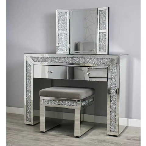 キラキラダイヤモンド破砕ベッドルーム家具女の子バニティドレッシングテーブルデザインLEDミラーとスツールドレッシングテーブル